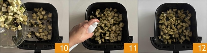 Disposez ensuite les aubergines dans le panier de la friteuse à air, vous pouvez utiliser du papier sulfurisé, mais seulement si vous avez le papier perforé spécial 10, sinon, vous pouvez également ne pas l'utiliser. (nous avons utilisé une friteuse d'une capacité de 6,5 litres). Une fois les aubergines placées à l'intérieur du panier, vaporisez de l'huile en spray ou versez un filet d'huile 11 12.
