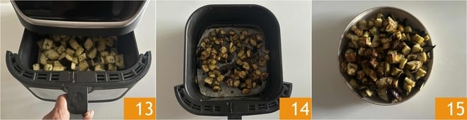 Faites ensuite cuire les aubergines à 200° pendant environ 15 minutes, en prenant soin de les vérifier à mi-cuisson 13 et si nécessaire, de les mélanger. Les temps peuvent légèrement varier en fonction de la friteuse et de la taille des aubergines, évaluez la dorure et une fois dorées, elles seront prêtes 14. Transférez-les dans un petit bol et servez vos aubergines à la friteuse à air 15.