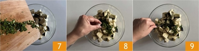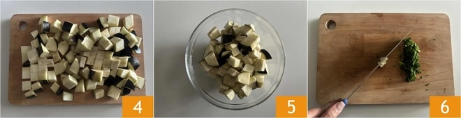 Lorsque vous avez obtenu vos dés 4, déplacez-les dans un bol 5. Hachez finement le basilic, le persil et l'ail 6.