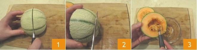 Pour préparer le melon farci de fruits et glace, commencez par couper chaque melon en deux 1. Coupez ensuite le sommet de chaque moitié 2, afin de créer une base pour celles qui seront vos coupes de melon. À l'aide d'une cuillère ou d'une cuillère parisienne, retirez les graines et les filaments du cœur du melon 3.