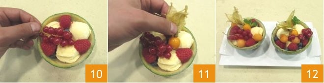 Répartissez les billes de melon et les fruits rouges dans les petites coupes, ajoutez les framboises, puis décorez chaque coupe avec une grappe de groseilles 10, un physalis 11 et une feuille de menthe. Votre melon farci de fruits et glace est prêt à être servi 12 !