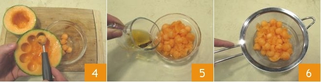Avec la cuillère parisienne, prélevez la chair du melon en billes 4 et placez-les dans un bol. Arrosez les billes de melon avec le Grand Marnier 5 et laissez mariner pendant environ 30 minutes. Une fois le temps écoulé, égouttez le melon de la marinade 6 et placez-le dans un bol.