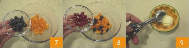 Ajoutez les myrtilles lavées 7 et les groseilles 8, en réservant 4 grappes entières pour la décoration. Prenez ensuite les petites coupes de melon vidées et remplissez-les de glace 9, en plaçant 3 boules dans chaque coupe.
