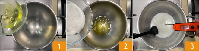 Pour préparer la meringue suisse, commencez par placer un cul-de-poule sur une casserole avec de l'eau. Versez-y les blancs d'œufs 1 et le sucre 2 et allumez le feu à feu moyen. Faites cuire au bain-marie, en veillant à ce que l'eau ne touche pas le cul-de-poule, en remuant constamment avec une spatule 3 et en surveillant la température avec un thermomètre de cuisine. Vous devrez atteindre une température de 60-65°C.