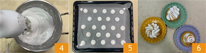 À ce stade, retirez le cul-de-poule du feu et de la casserole d'eau et montez avec un fouet électrique 4 jusqu'à refroidissement complet de la meringue. Le mélange doit être brillant et avoir la consistance de la mousse à raser et sera prêt si, en soulevant le fouet, vous observez la formation d'une pointe. Vous pouvez utiliser la meringue de deux façons. Transférez-la dans une poche à douille avec une douille étoilée et dressez-la, en réalisant 30 petits dômes, sur une plaque recouverte de papier sulfurisé 5. Faites cuire dans un four statique à 90°C pendant environ 2 heures. Elles seront prêtes lorsqu'elles seront sèches, très légères et creuses à l'intérieur. Ou vous pouvez utiliser la meringue suisse pour décorer vos desserts et la flamber avec un chalumeau 6.