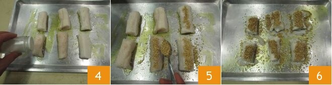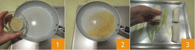 Pour préparer le merlu croustillant avec salade de pamplemousse, rincez le quinoa sous l'eau courante, puis faites-le griller dans une poêle antiadhésive 1 et faites-le cuire à feu doux pendant 4-5 minutes, en remuant de temps en temps jusqu'à ce qu'il soit doré ; mettez-le de côté 2. Sur une plaque de cuisson, versez de l'huile et déposez les filets de merlu 3,