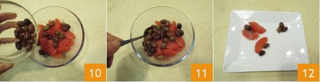 Lorsque vous aurez terminé, recueillez les quartiers dans un bol et ajoutez les olives noires 10, puis assaisonnez de sel et de poivre et mélangez le tout 11. Passez enfin à la composition : sur un plat de service, disposez un peu de salade de pamplemousse et d'olives taggiasche 12