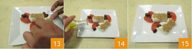 et puis déposez les filets 13. Garnissez d'un filet d'huile cru à votre convenance 14 et voici votre merlu croustillant avec salade de pamplemousse : bon appétit 15 !