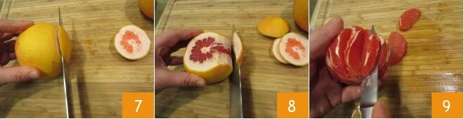 Pendant que les filets de merlu cuisent au four, préparez la salade de pamplemousse. Pour commencer, vous devrez peler le pamplemousse à vif. Coupez ensuite les calottes 7, puis le reste de la peau en faisant attention à retirer également la partie blanche 8. Avec un couteau à lame lisse et affûtée, extrayez la pulpe en quartiers, en suivant les veines de la membrane 9