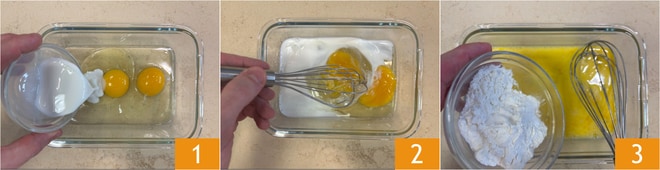 Pour préparer le cabillaud frit, commencez par la pâte. Dans un bol, versez les œufs et le lait 1, puis mélangez avec un fouet 2. Ajoutez la farine 3 et le sel.
