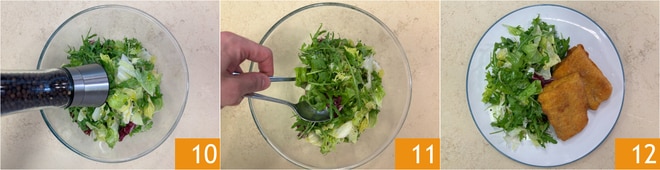Salez, poivrez 10 et mélangez 11. Votre cabillaud frit est prêt à être servi avec un accompagnement de salade fraîche 12 !