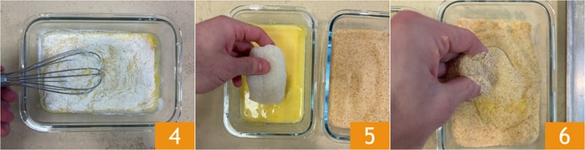Mélangez soigneusement pour éviter les grumeaux 4. À ce stade, passez les filets de cabillaud d'abord dans la pâte 5 puis dans la chapelure 6, en appuyant bien pour la faire adhérer.