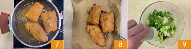 Chauffez l'huile végétale dans une casserole et faites frire quelques filets à la fois pendant environ 10 minutes, en les retournant à mi-cuisson : ils doivent être bien dorés et croustillants 7. Transférez-les sur du papier absorbant pour éliminer l'excès d'huile 8. Pendant ce temps, préparez la salade et assaisonnez-la avec de l'huile 9.