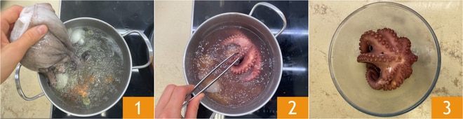 Pour préparer la mescafrancesca pommes de terre et poissons, commencez par le poulpe : portez à ébullition une casserole d'eau dans laquelle vous aurez ajouté une carotte, du céleri et de l'oignon coupés grossièrement, puis plongez le poulpe 1 et faites cuire pendant 40 minutes. Une fois ce temps écoulé, égouttez le poulpe 2 et laissez-le refroidir dans un bol à part 3. Pour plus de détails, vous pouvez consulter la fiche "Comment nettoyer et cuire le poulpe".