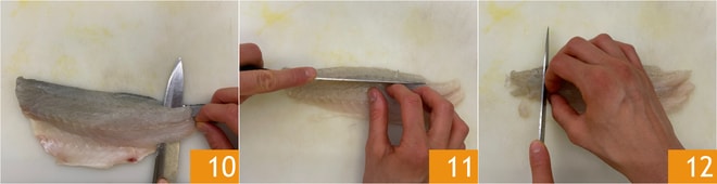 Passez au nettoyage des autres poissons : enlevez la peau du filet de bar 10 et coupez-le d'abord en lanières 11 puis en cubes 12.