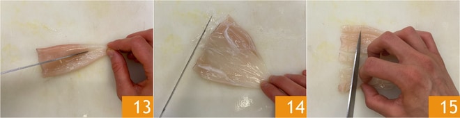 Nettoyez les calamars (pour plus d'informations, vous pouvez consulter la fiche "Comment nettoyer les calamars"). Coupez le manteau des calamars dans la longueur pour l'ouvrir 13, puis grattez la partie intérieure avec le dos d'un couteau pour la nettoyer et retirer la petite peau 14. Coupez également les calamars d'abord en lanières puis en petits morceaux réguliers 15.