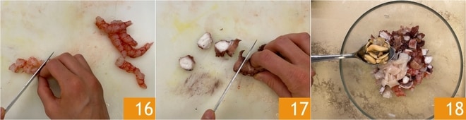 Nettoyez les crevettes (pour plus d'informations, vous pouvez consulter la fiche "Comment nettoyer les crevettes") et coupez la chair en morceaux de même taille 16. Enfin, réduisez également 100 g de poulpe cuit en morceaux 17. Transférez le bar, les calamars, les crevettes et le poulpe dans un bol, puis ajoutez également les moules et les palourdes décortiquées avec leur liquide 18.