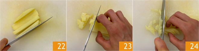 Consacrez-vous maintenant aux pommes de terre : épluchez-les et coupez-les d'abord en tranches puis en bâtonnets 22. Réduisez en cubes les bâtonnets centraux, de forme plus régulière 23, et émincez les parties latérales 24.