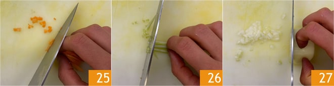 Nettoyez et coupez en brunoise les carottes 25, le céleri 26 et l'oignon 27.