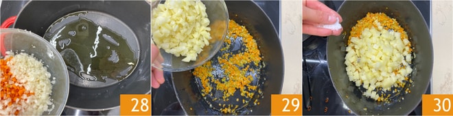 Vous pouvez passer à la cuisson : chauffez l'huile dans une grande casserole, puis ajoutez les légumes pour le soffritto 28 et faites rissoler à feu doux pendant une dizaine de minutes. À ce stade, ajoutez les pommes de terre au soffritto 29 et salez 30.
