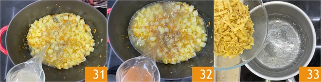 Versez le fumet de poisson 31 et le fumet de crustacés 32 et faites cuire à feu moyen pendant environ 15-20 minutes. Entre-temps, portez à ébullition une casserole d'eau salée et faites cuire les pâtes mixtes pendant environ 4 minutes 33.
