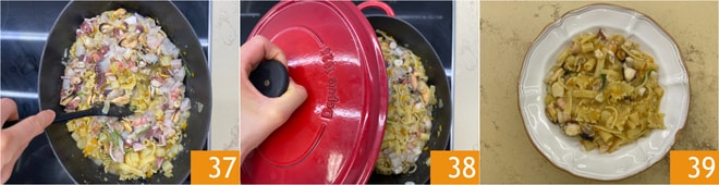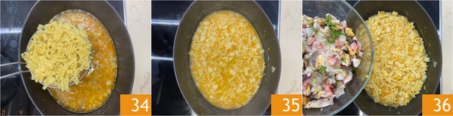 Égouttez les pâtes, transférez-les dans la casserole 34 et poursuivez la cuisson pendant environ 5 minutes 35. Lorsque les pâtes sont al dente et que les pommes de terre sont tendres et crémeuses, éteignez le feu et attendez que l’ébullition cesse, puis ajoutez tous les poissons 36.