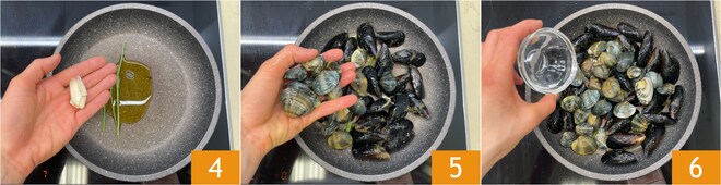 Entre-temps, occupez-vous des fruits de mer : nettoyez les moules et les palourdes (pour plus d'informations, vous pouvez consulter nos fiches "Comment nettoyer et ouvrir les moules" et "Comment nettoyer les palourdes"). Dans une grande poêle, faites revenir l'huile avec les tiges de persil et la gousse d'ail 4, puis ajoutez les moules et les palourdes 5. Versez un peu d'eau 6 et faites cuire à feu vif en remuant souvent la poêle.