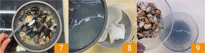 Au fur et à mesure que les coquilles s'ouvrent, retirez les fruits de mer avec une pince 7 et mettez-les de côté. Une fois qu'ils sont tous ouverts, filtrez le fond de cuisson à travers un chinois 8. À ce stade, décortiquez les moules et les palourdes et gardez les mollusques dans le fond de cuisson filtré 9.