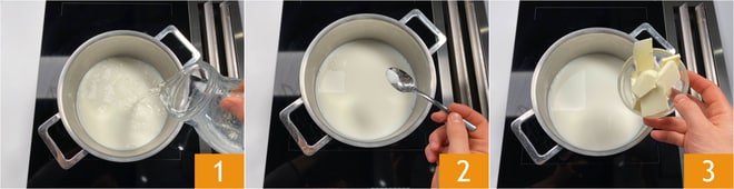 Pour préparer le migliaccio au chocolat, chauffez dans une casserole le lait, l'eau 1, le sel 2 et le beurre 3.