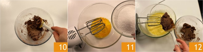 Mélangez et réservez 10. Dans un grand récipient, battez les œufs avec le sucre au batteur électrique 11 pendant quelques minutes jusqu'à ce qu'ils deviennent légèrement plus gonflés. Ajoutez ensuite le mélange de ricotta et de cacao 12.