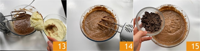 Ensuite, incorporez la semoule tiédie 13 et mélangez toujours avec le batteur 14. Enfin, ajoutez le chocolat haché 15.