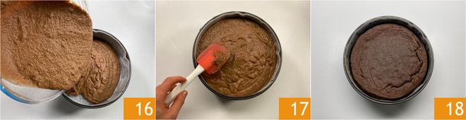 Mélangez et versez dans un moule de 24 cm beurré et chemisé avec du papier sulfurisé 16. Nivelez la surface avec une spatule 17 et faites cuire dans un four statique préchauffé à 180° pendant environ 80 minutes. Laissez refroidir 18 complètement avant de le placer au frigo pour encore quelques heures, puis servez.