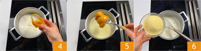 Ajoutez le zeste d’orange 4 pour parfumer. Portez à ébullition sur feu moyen-vif. Une fois l'ébullition atteinte, retirez le zeste des liquides 5 et versez la semoule en pluie 6. Remuez avec un fouet pour éviter la formation de grumeaux et faites cuire à feu moyen pendant 3-4 minutes.