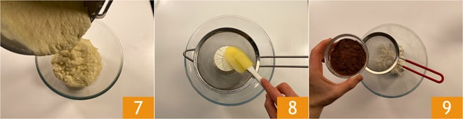 Transférez le mélange dans un bol 7, couvrez de film plastique et laissez tiédir. Pendant ce temps, tamisez la ricotta 8 et ajoutez le cacao 9.