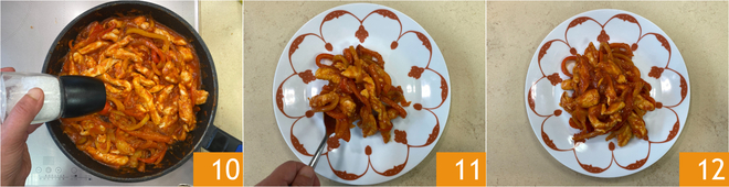Rectifiez l'assaisonnement en sel et poivre 10 et dressez votre plat 11. Vos émincés de poulet aux poivrons sont prêts à être servis 12.