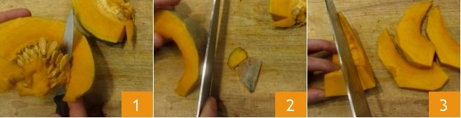 Pour réaliser la soupe de potiron à la milanaise, commencez par nettoyer la courge. Coupez-la en deux puis en quartiers, videz-la des graines et des filaments internes 1 et retirez la peau 2. Réduisez-la en tranches d'une épaisseur de 2-3 mm 3 et placez-les dans une casserole.