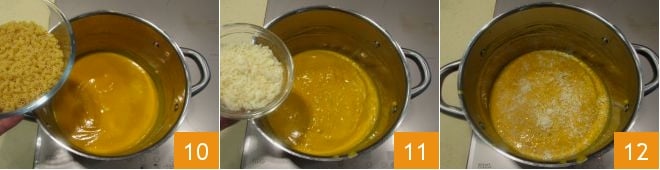 Versez les pâtes dans le velouté obtenu 10 et faites-les cuire à feu modéré, en remuant fréquemment pour éviter qu'elles ne collent au fond. Assaisonnez avec le Grana Padano râpé 11, en en gardant un peu de côté pour le service.