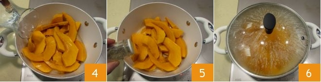 Ajoutez l'eau 4, assaisonnez de sel et de poivre 5 puis faites mijoter la courge pendant quelques minutes en couvrant la casserole avec un couvercle 6.
