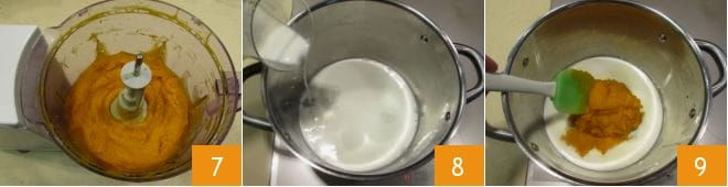 Une fois cuite, transférez-la dans un mixeur et actionnez les lames jusqu'à obtenir une crème homogène 7. Dans une autre casserole, portez le lait à ébullition 8 puis ajoutez-y la courge 9, en mélangeant soigneusement.