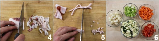Coupez le lard en lanières 4 et la couenne en petits dés 5. Lavez et, à part les petits oignons qui doivent simplement être pelés, coupez en dés tous les légumes : les courgettes, le céleri, les carottes, les tomates 6, les pommes de terre et la moitié de l'oignon.
