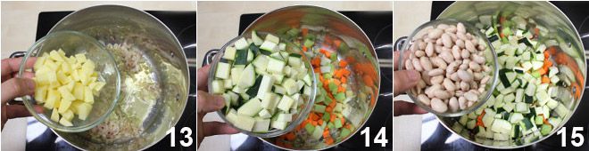 À ce stade, vous pouvez ajouter peu à peu tous les légumes : les pommes de terre 13, le céleri, la carotte et les courgettes 14, puis les haricots 15 et mélangez avec une cuillère en bois.