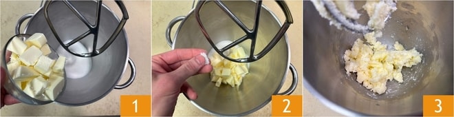 Pour préparer les mini cassates au four, commencez par la pâte brisée: dans le bol de votre robot muni d'une feuille, versez le sucre, le beurre coupé en cubes (sorti du réfrigérateur 5 minutes avant)1 et une pincée de sel 2. Mélangez quelques instants pour amalgamer 3.