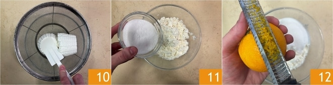 Occupez-vous maintenant de la garniture: égouttez bien la ricotta, puis passez-la au tamis dans un bol 10. Ajoutez le sucre 11 et le zeste d'orange râpé 12.