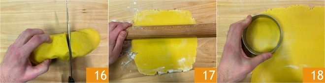 Récupérez la pâte brisée du réfrigérateur, prélevez les 2/3 16 et étalez-la avec un rouleau à pâtisserie à une épaisseur de 4mm 17. Découpez 12 disques à l'aide d'un emporte-pièce d'environ 12 cm de diamètre 18.