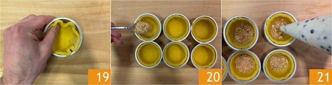 Beurrez et farinez 12 moules de 8 cm de diamètre et tapissez-les avec les disques de pâte brisée 19. Conservez au réfrigérateur les chutes et un peu de pâte pour réaliser les couvercles. Versez la moitié des biscuits secs au fond 20. Reprenez la garniture et transférez-la dans une poche à douille sans embout, puis pressez-la à l'intérieur des moules jusqu'à presque atteindre le bord 21 et lissez bien avec une spatule.