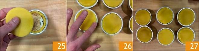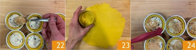 Déposez les petits disques de pâte dessus 25 et scellez bien les bords en appuyant légèrement 26. Avant d'enfourner, ou après environ 10 minutes de cuisson, percez la surface avec un cure-dent pour permettre à la vapeur de s'échapper. Faites cuire les mini cassates dans un four statique préchauffé à 175-180°C pendant environ 35-40 minutes, en les plaçant sur la première grille en bas 27.