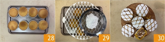 Une fois cuites 28, laissez-les refroidir complètement dans le moule. Enfin, retournez les gâteaux sur un plateau de service, saupoudrez-les de sucre glace 29 et, si vous avez une grille à tartes, utilisez-la comme pochoir pour obtenir une décoration élégante. À ce stade, vos mini cassates au four sont prêtes à être servies 30.