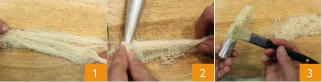 pour réaliser les mini croissants salés au saumon et stracchino, effilochez la pâte kataifi et créez une sorte de ruban 1, puis prenez des cônes en acier et badigeonnez-les de beurre. Enroulez la bande de pâte feuilletée autour du cône en commençant à enrouler la bande de pâte par la partie pointue du cône 2 en allant vers la partie la plus large 3,