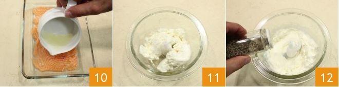 puis arrosez avec le jus de citron 10, couvrez de film plastique et conservez au réfrigérateur le saumon mariné. Pendant ce temps, préparez la crème : dans un mixeur avec des lames, mettez le stracchino 11, aromatisez avec du sel, du poivre 12,