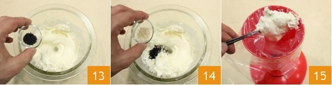 mixez pour le rendre crémeux puis ajoutez les graines de sésame noires 13 et blanches 14, mélangez pour aromatiser. Transférez la crème obtenue dans une poche à douille avec une douille étoilée 15